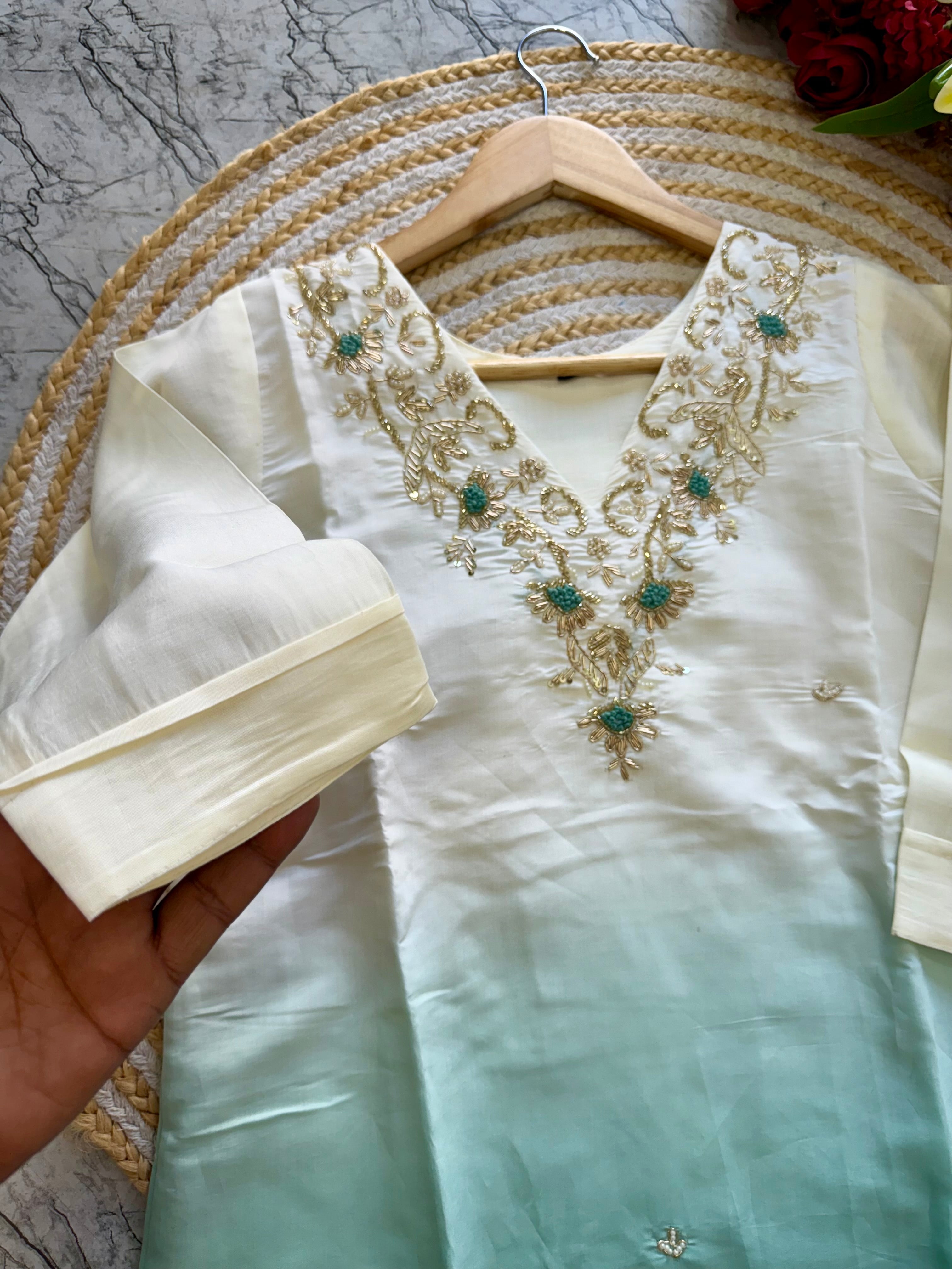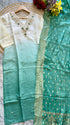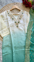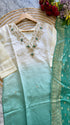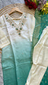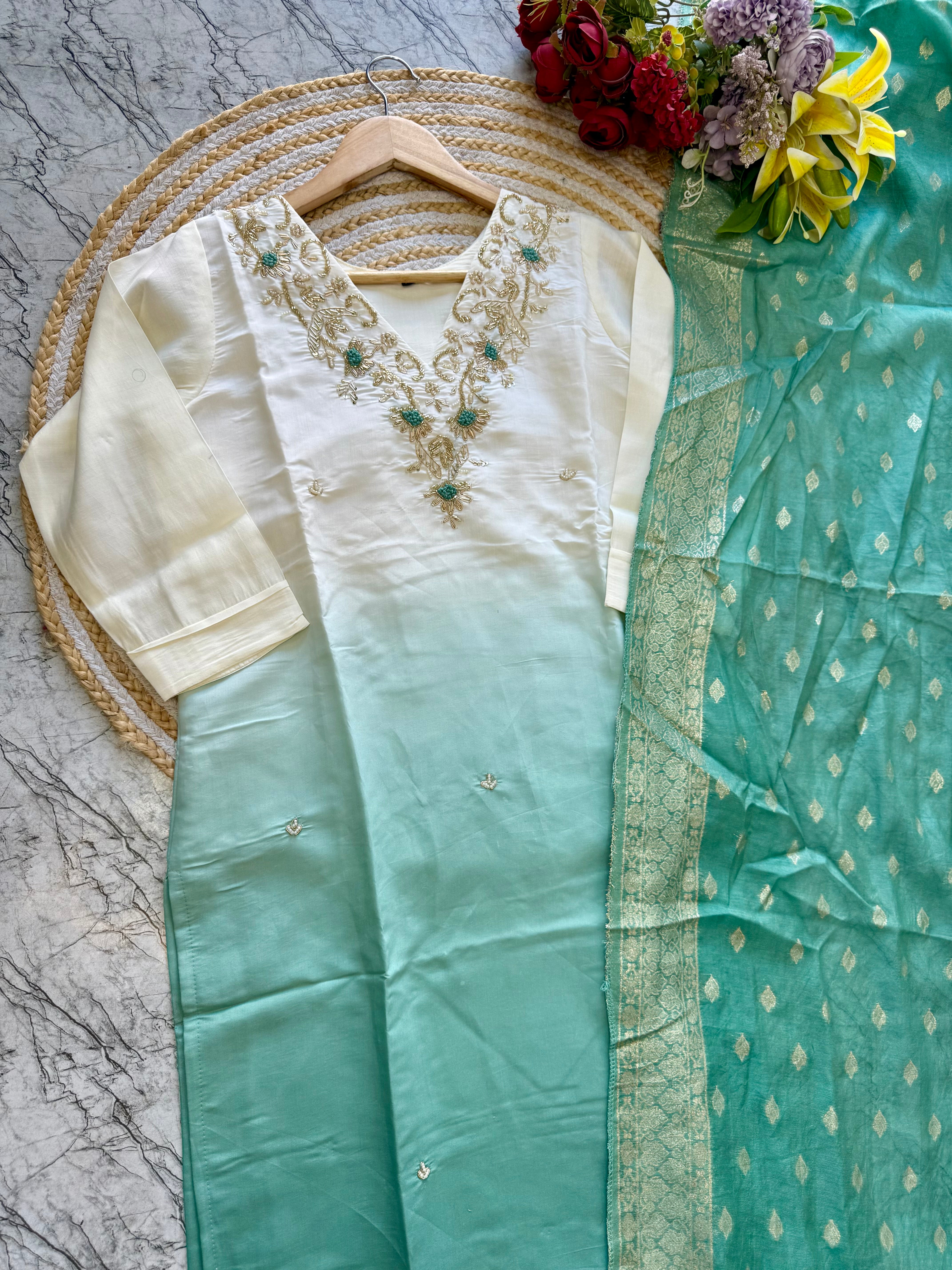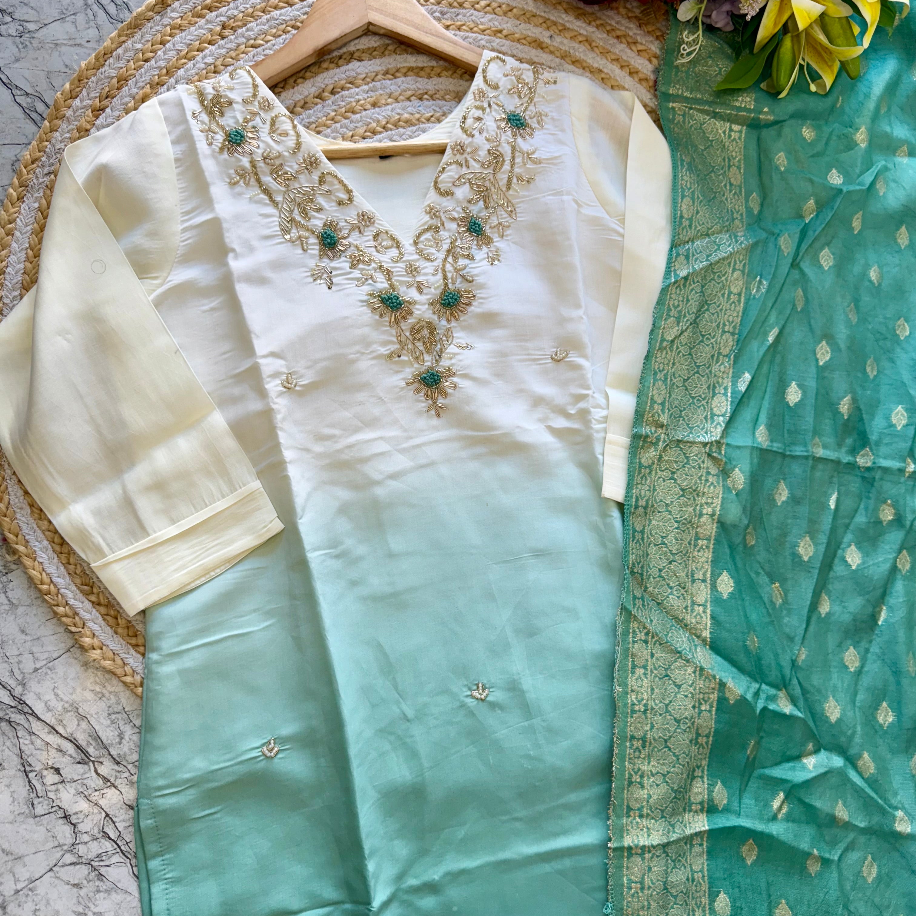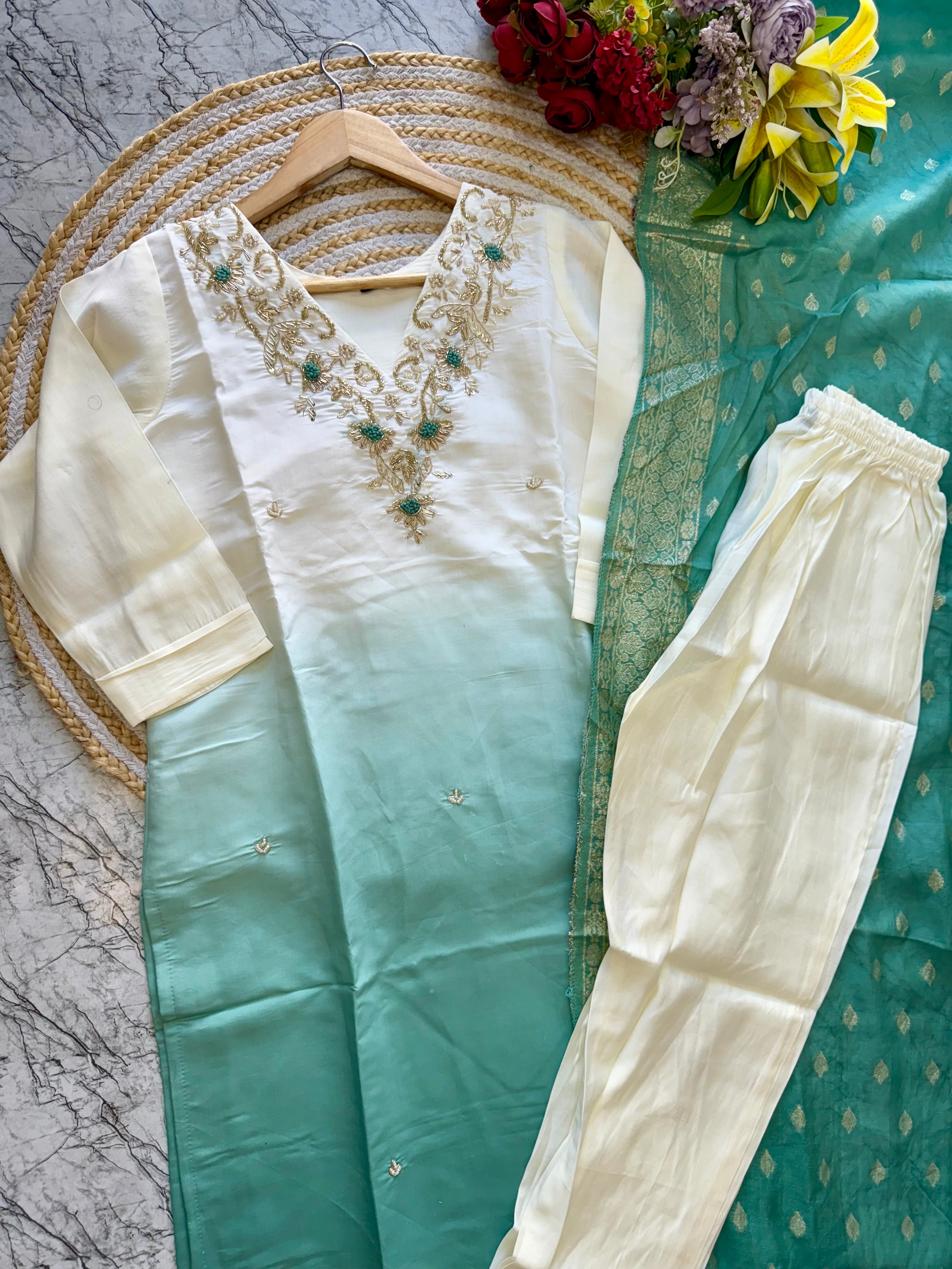 pure Roman silk top in ombre with attached lining, expertly lined for a luxurious feel. The silk pant adds a touch of sophistication, while the self-zari jacquard Chanderi dupatta drapes elegantly around you.