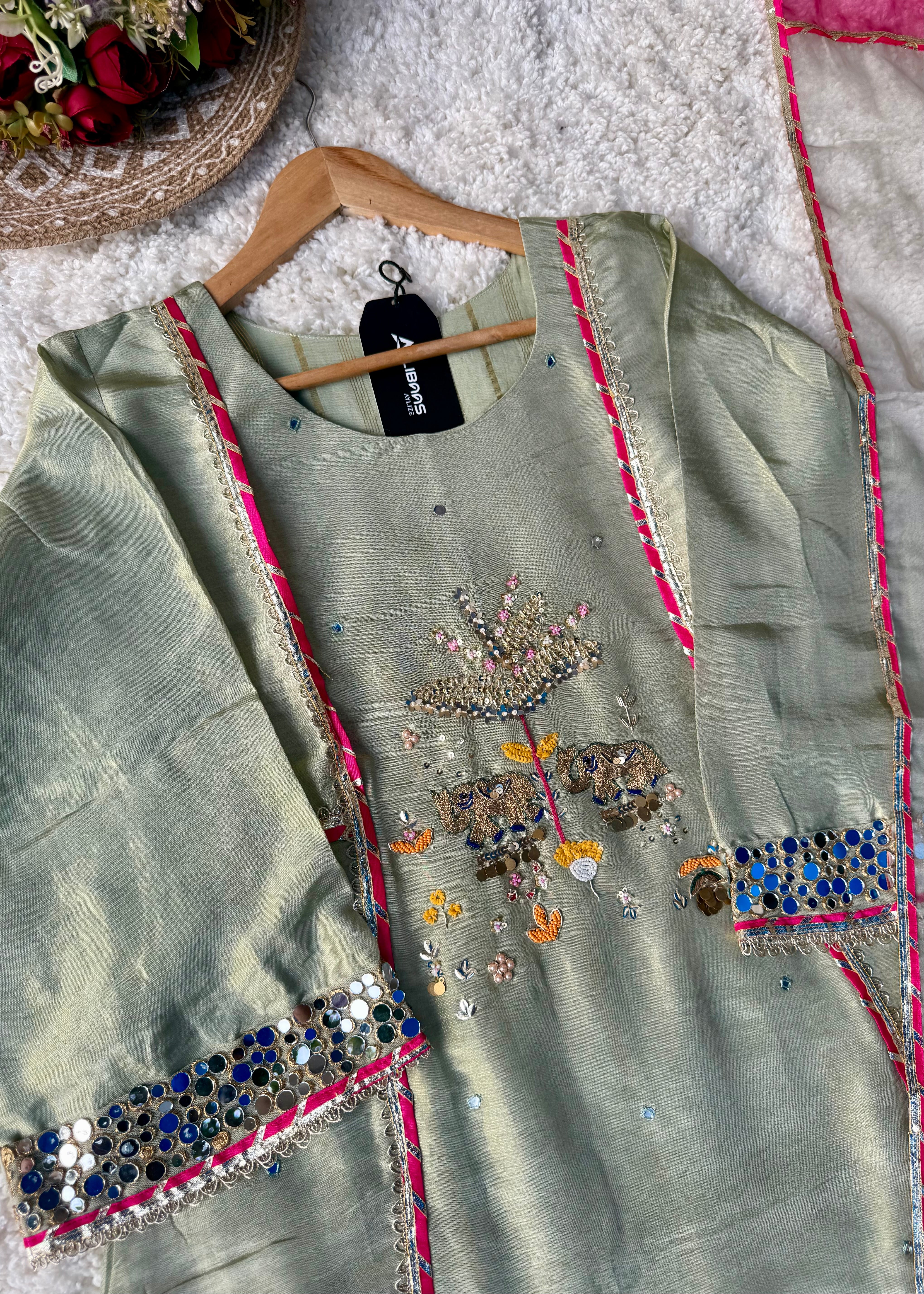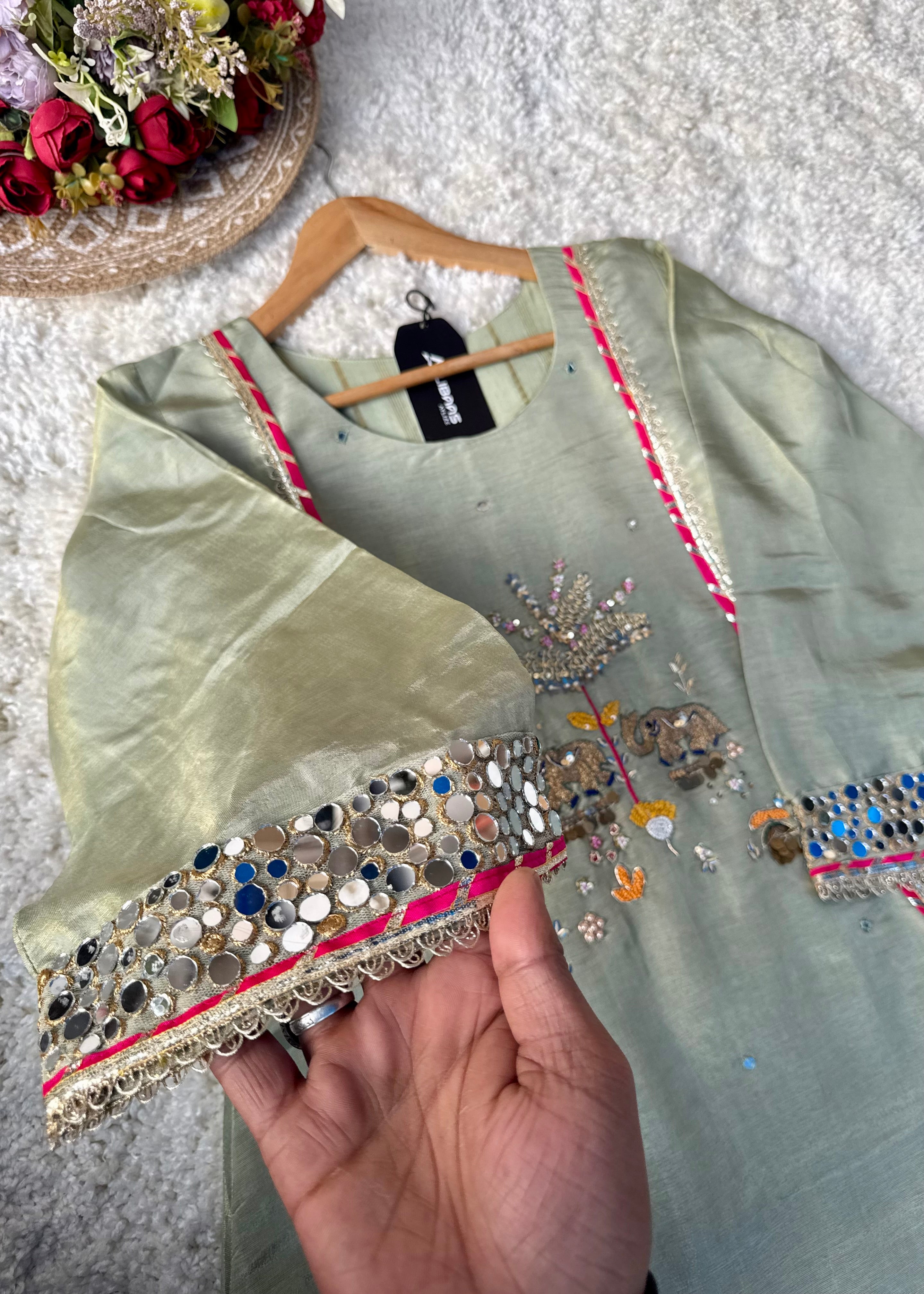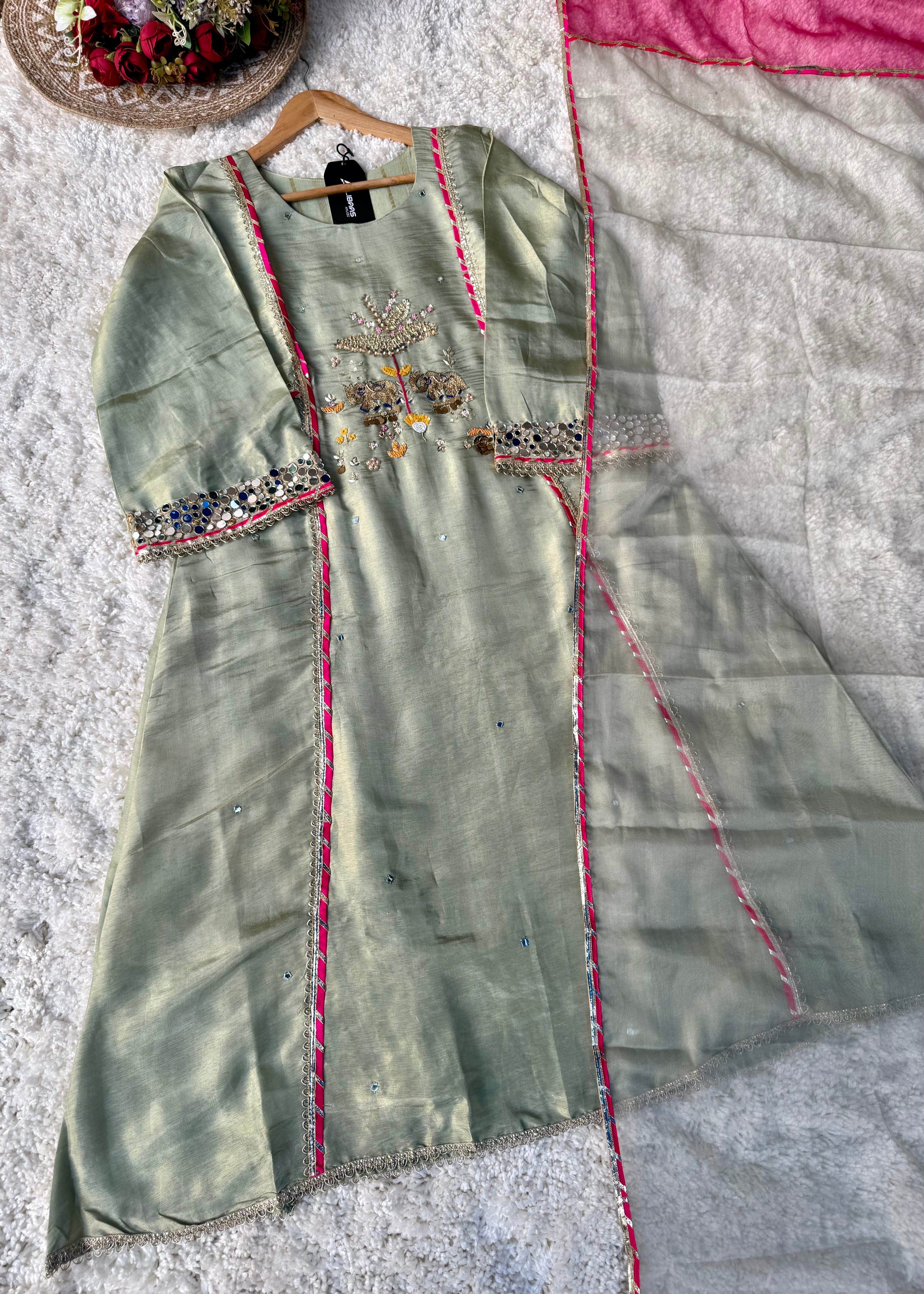 - Front detailing: Floral zari motifs, mirror floral vines, handcrafted highlights