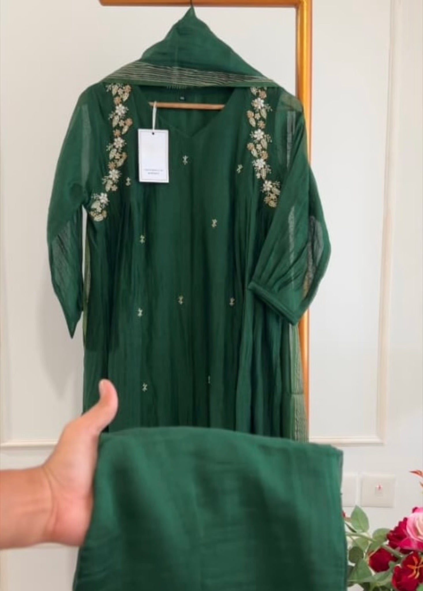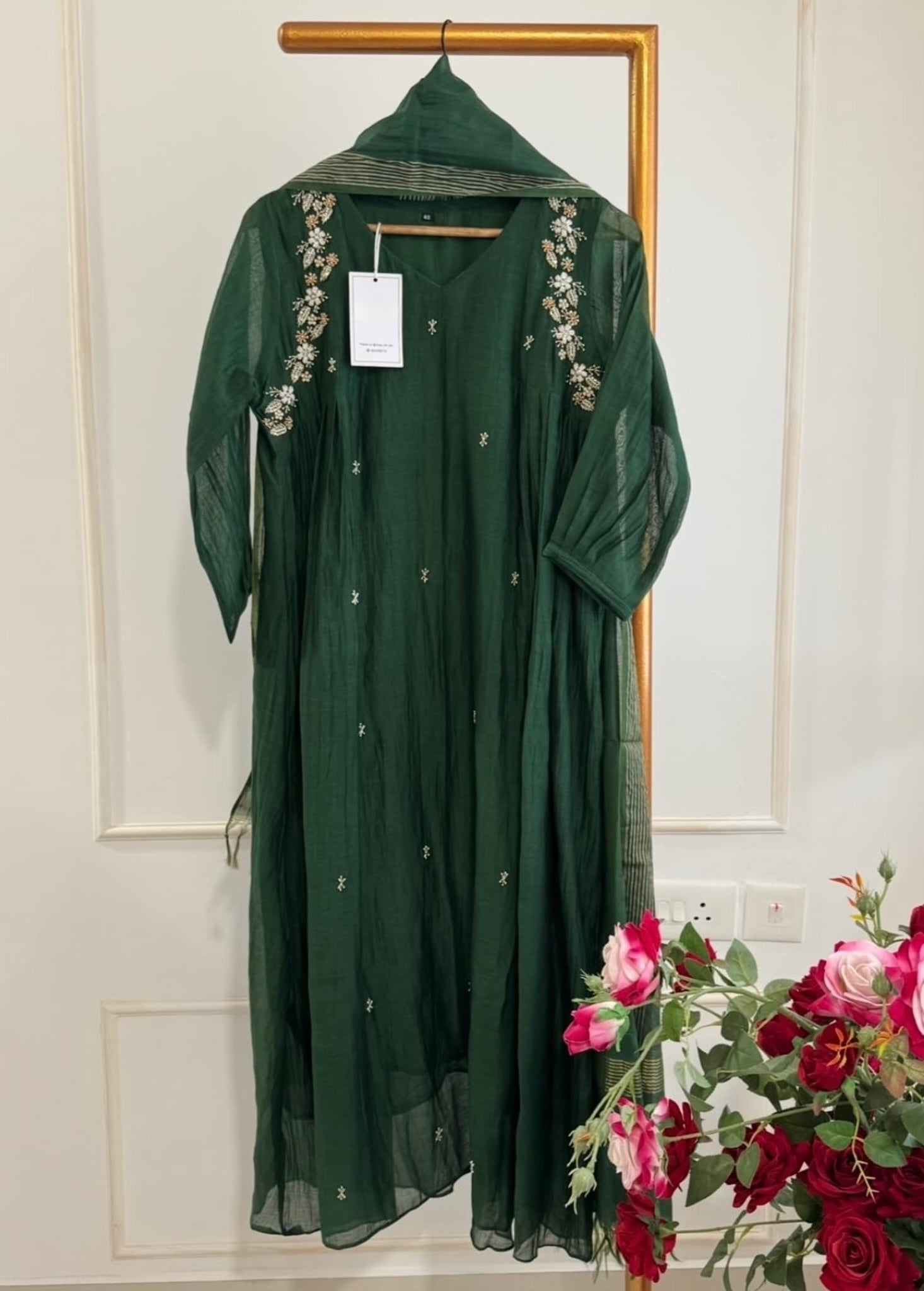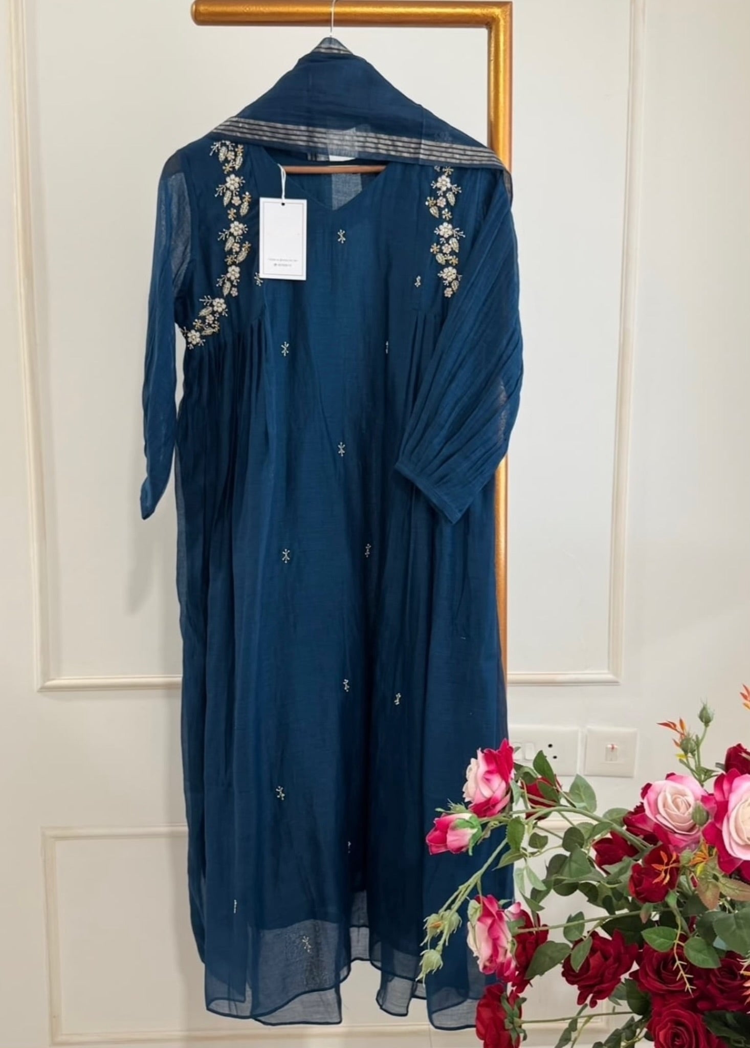 Premium mul Chanderi anarkali kurti with beautiful handwork on all over the the top with a long mul Chanderi dupatta and a mul chanderi bottom