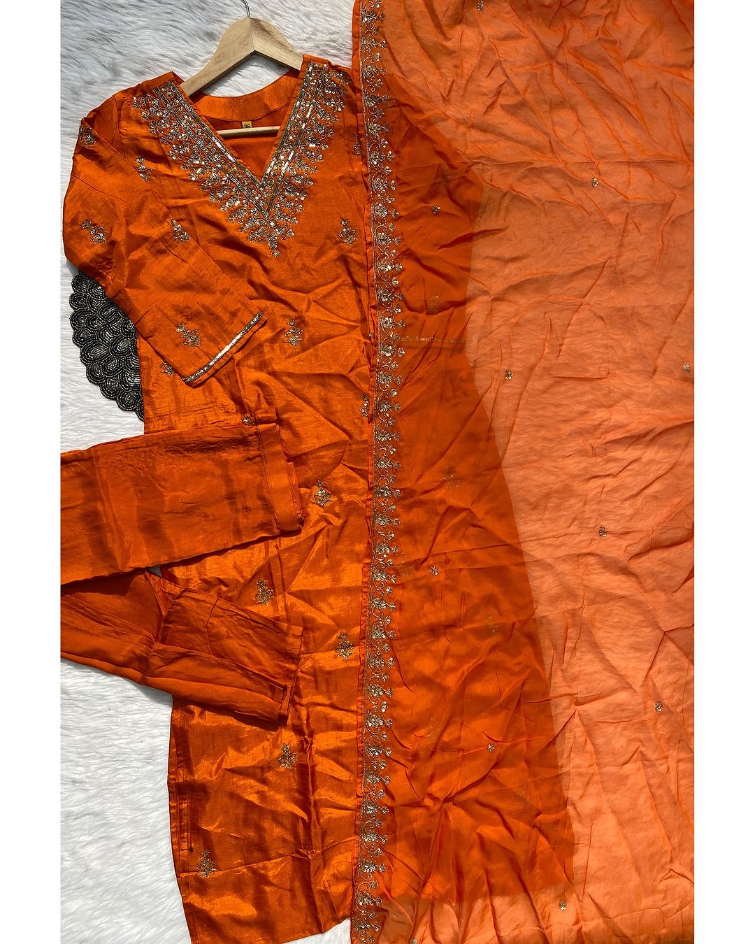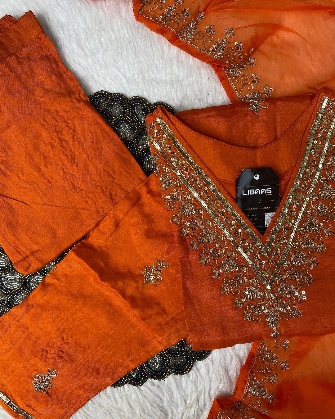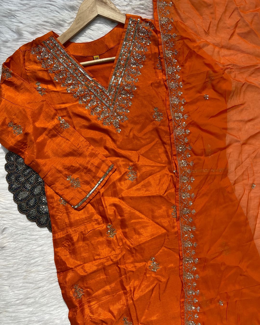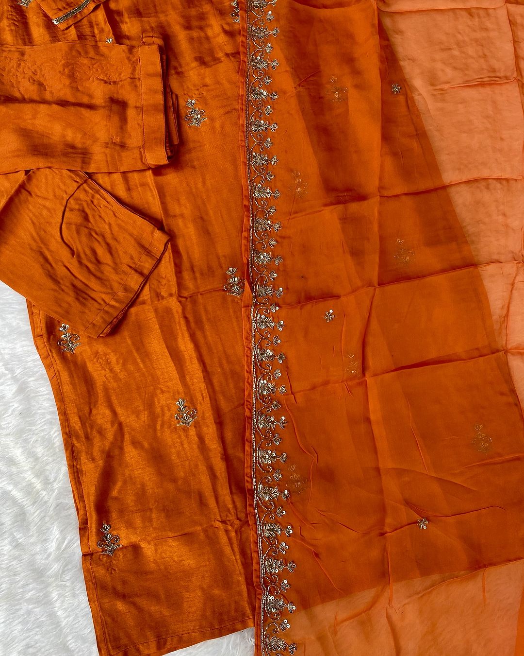 A very beautiful piece with heavy handwork on the yoke and sleeve of the kurta with a beautiful one sided scallop organza dupatta and a silk bottom