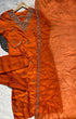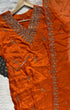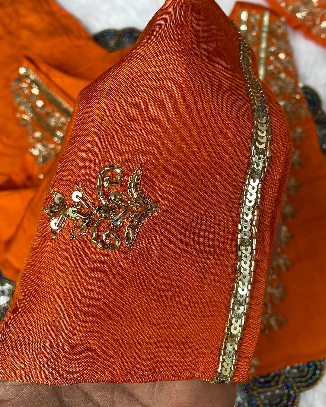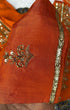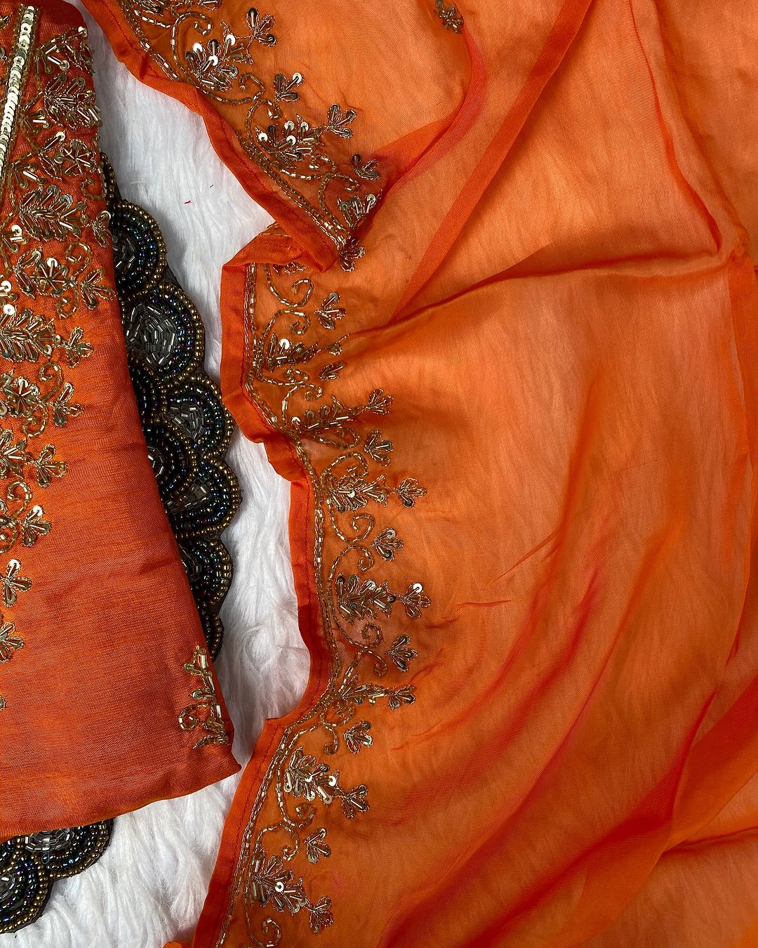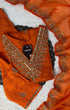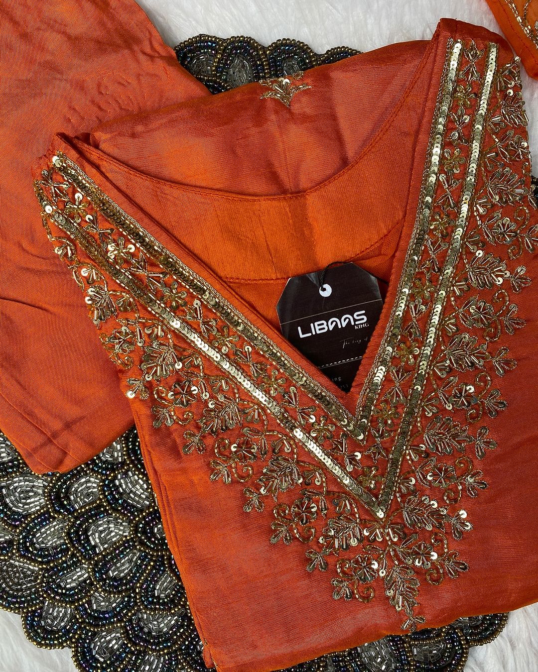 A very beautiful piece with heavy handwork on the yoke and sleeve of the kurta with a beautiful one sided scallop organza dupatta and a silk bottom