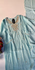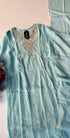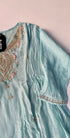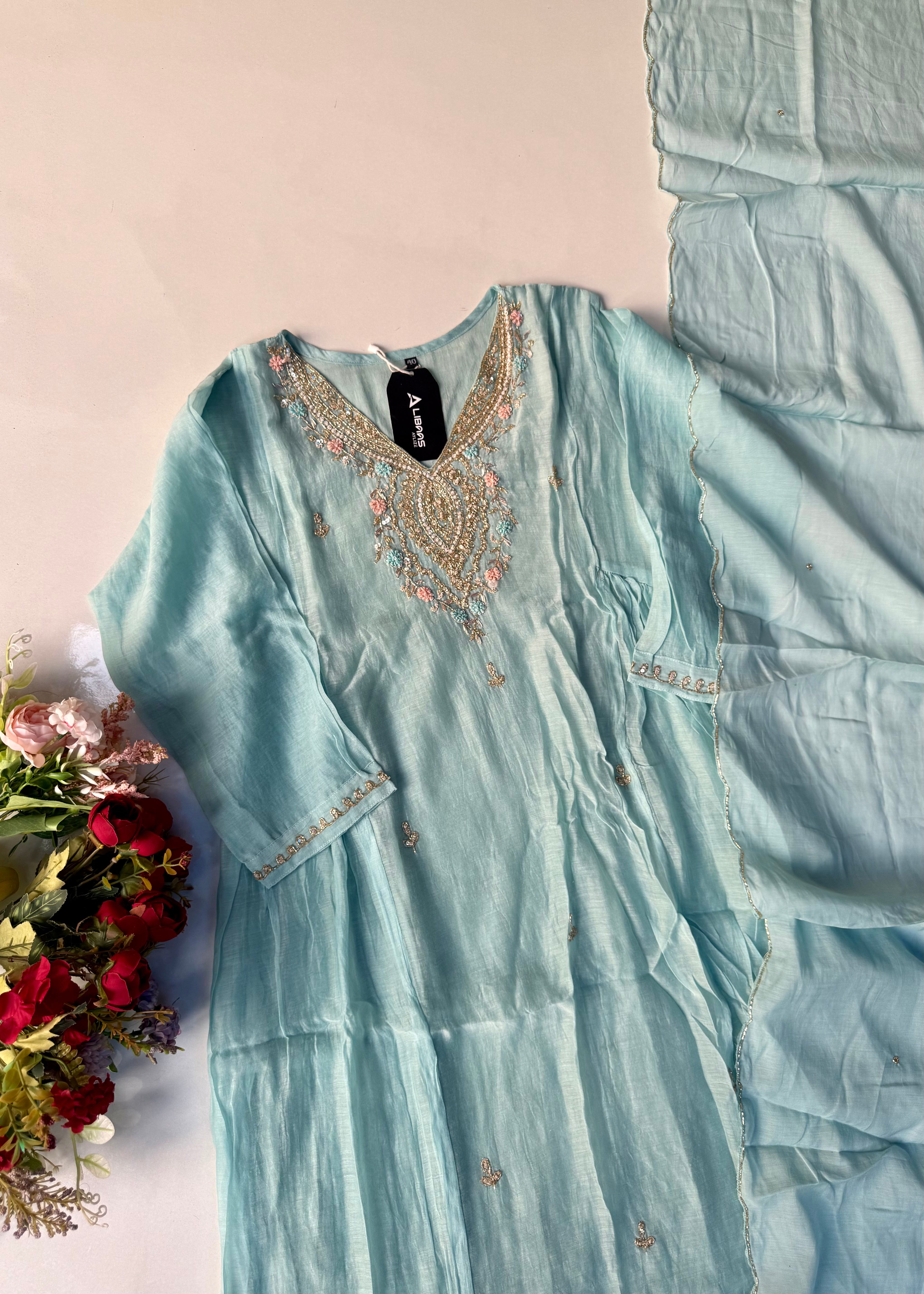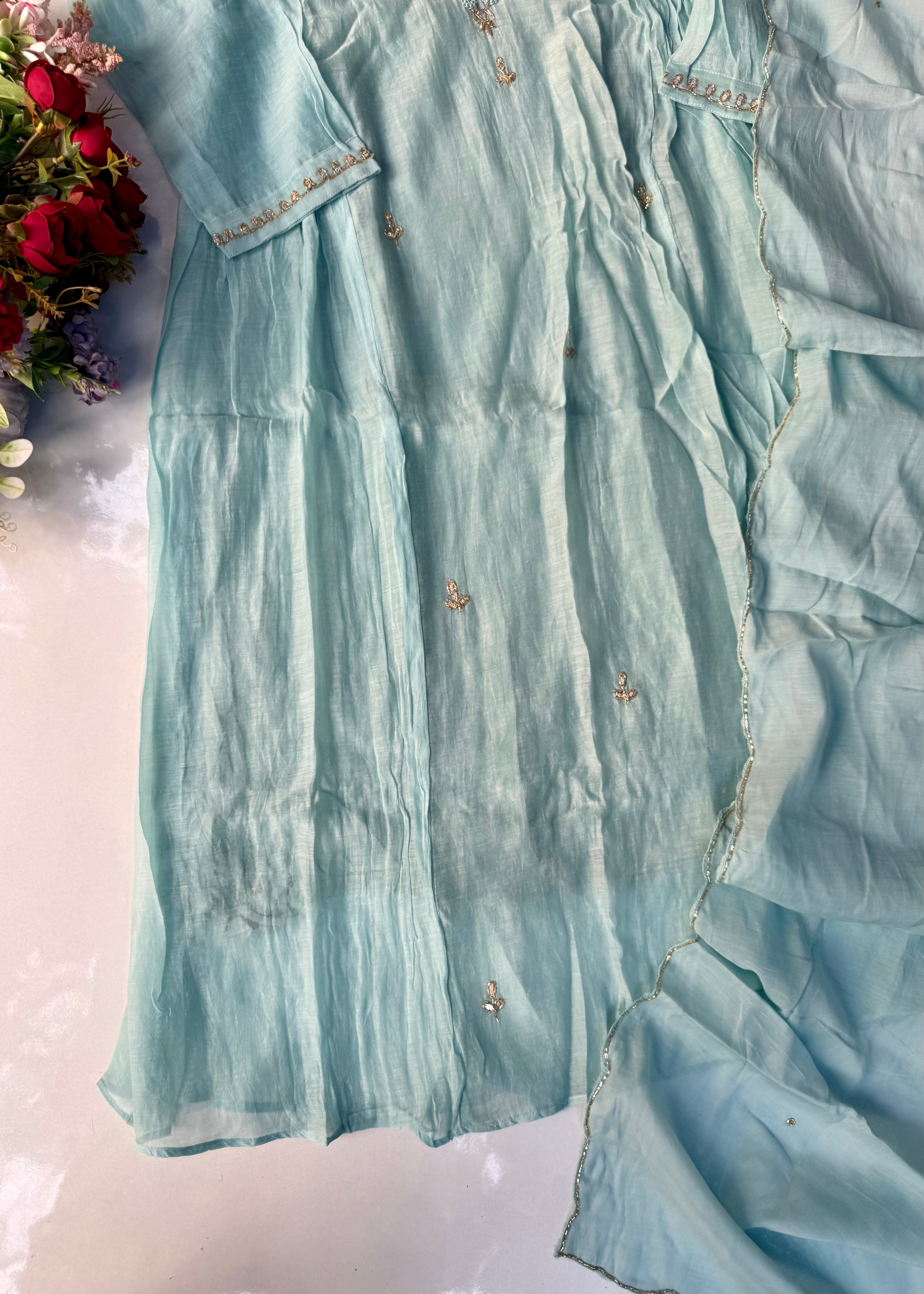 Beautiful premium mul chanderi kurti with zari and kadh dana work attached with mul cotton lining, comfortable mul chanderi pants with cotton lining and full length soft mul cotton dupatta covered with beautiful zari work.