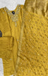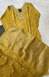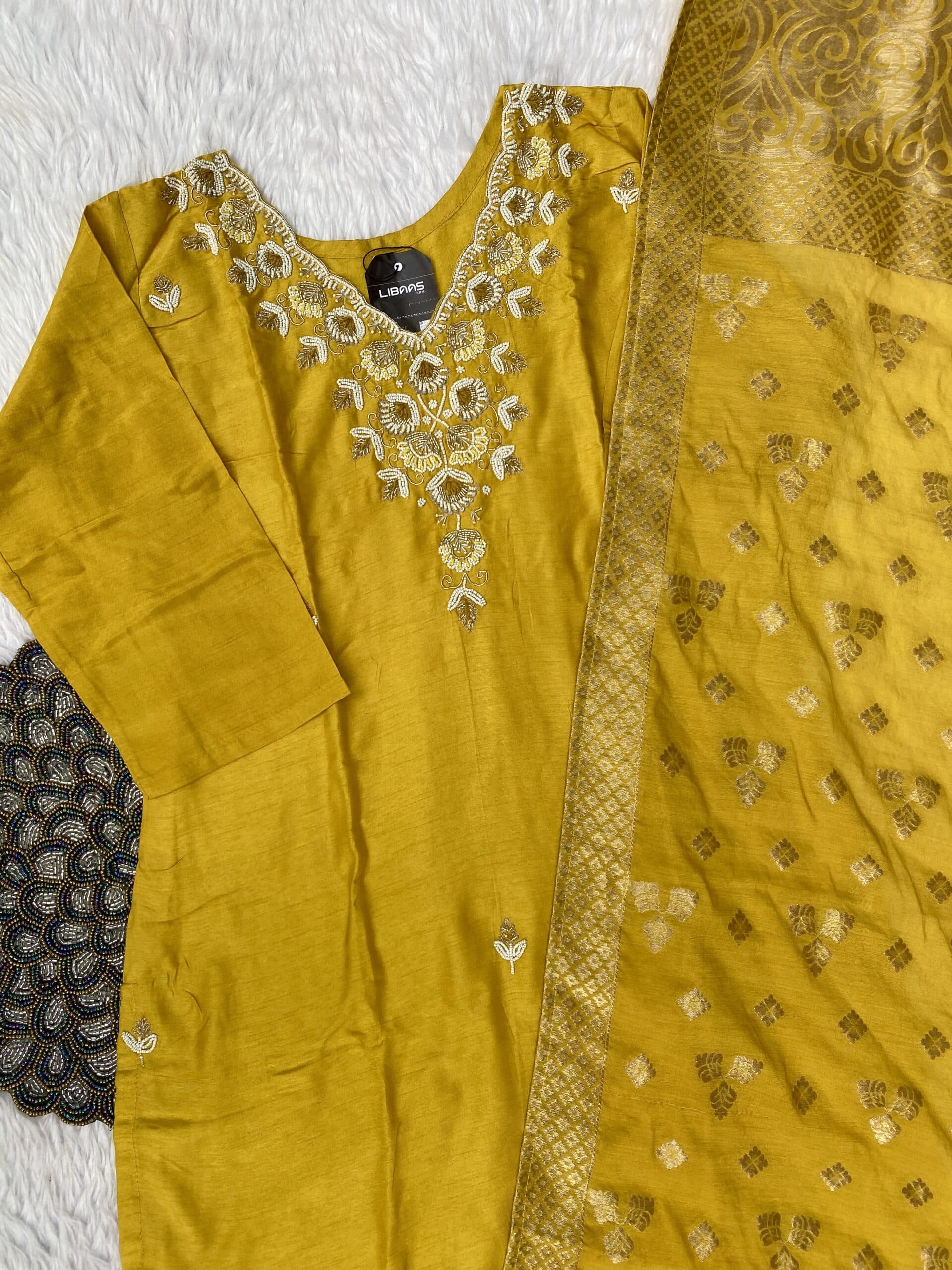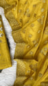 Beautiful yellow handwork set with handwork on the yoke of the kurta and small motives all over the body of the kurta with a long woven bansari dupatta and a plane silk bottom