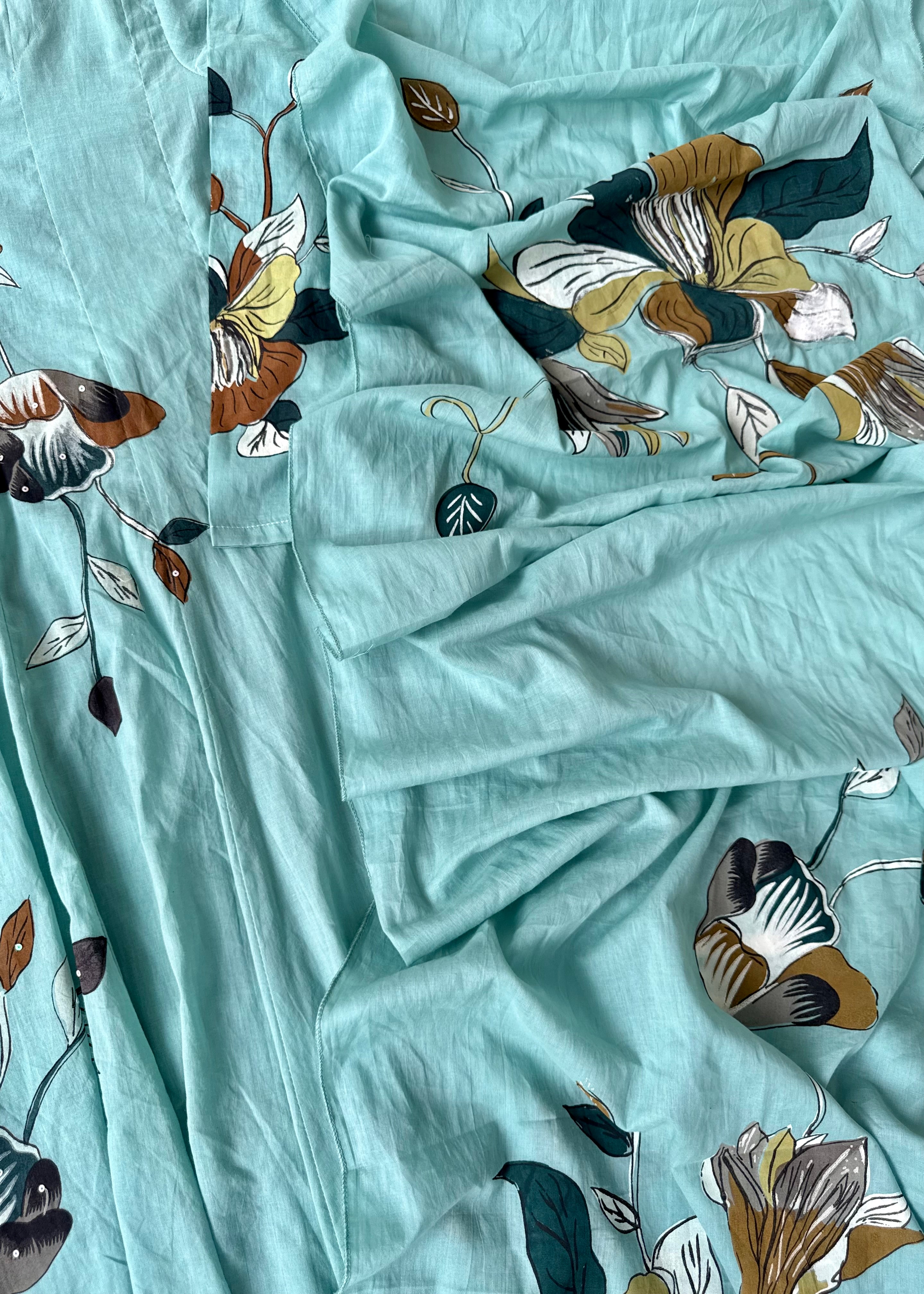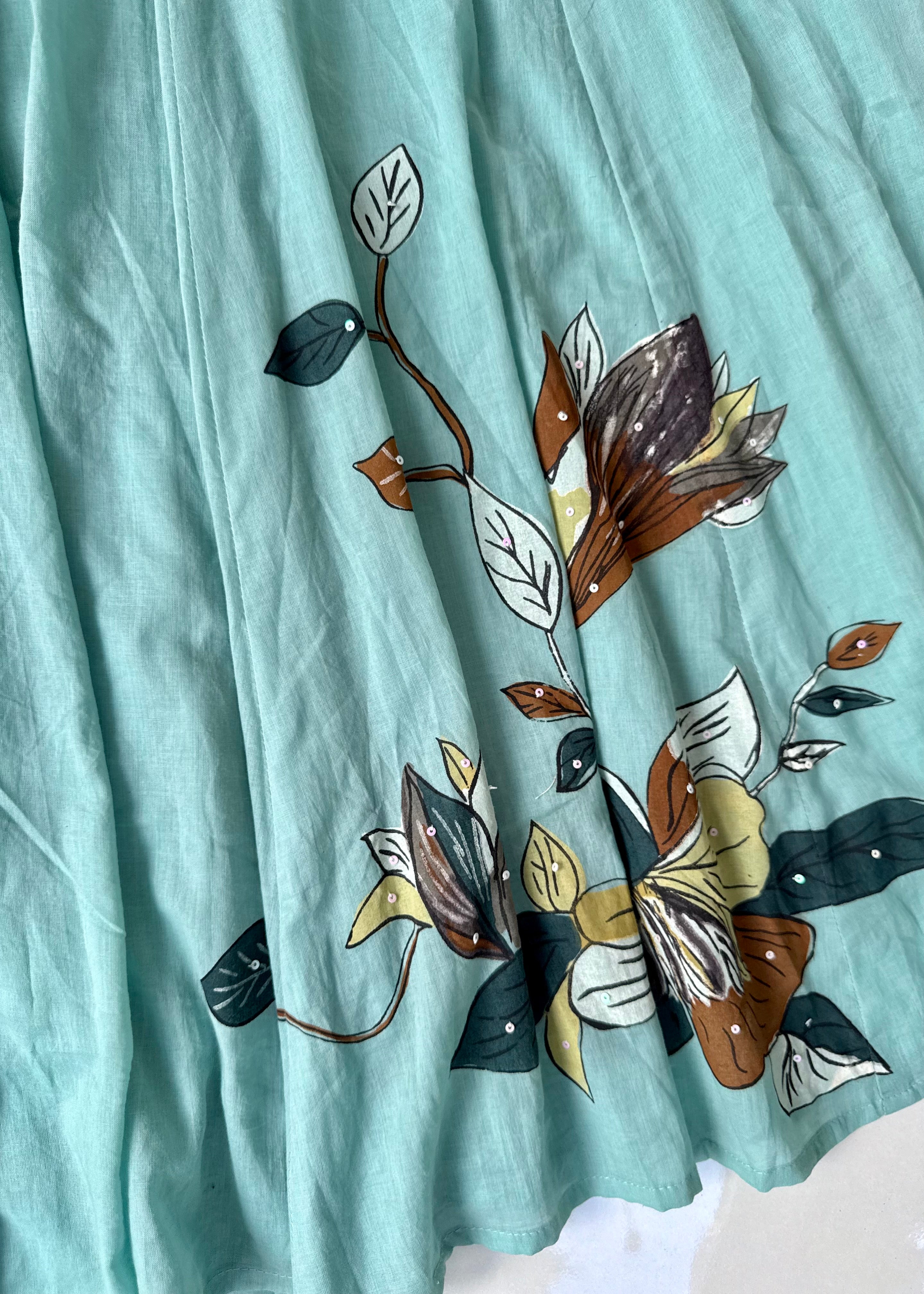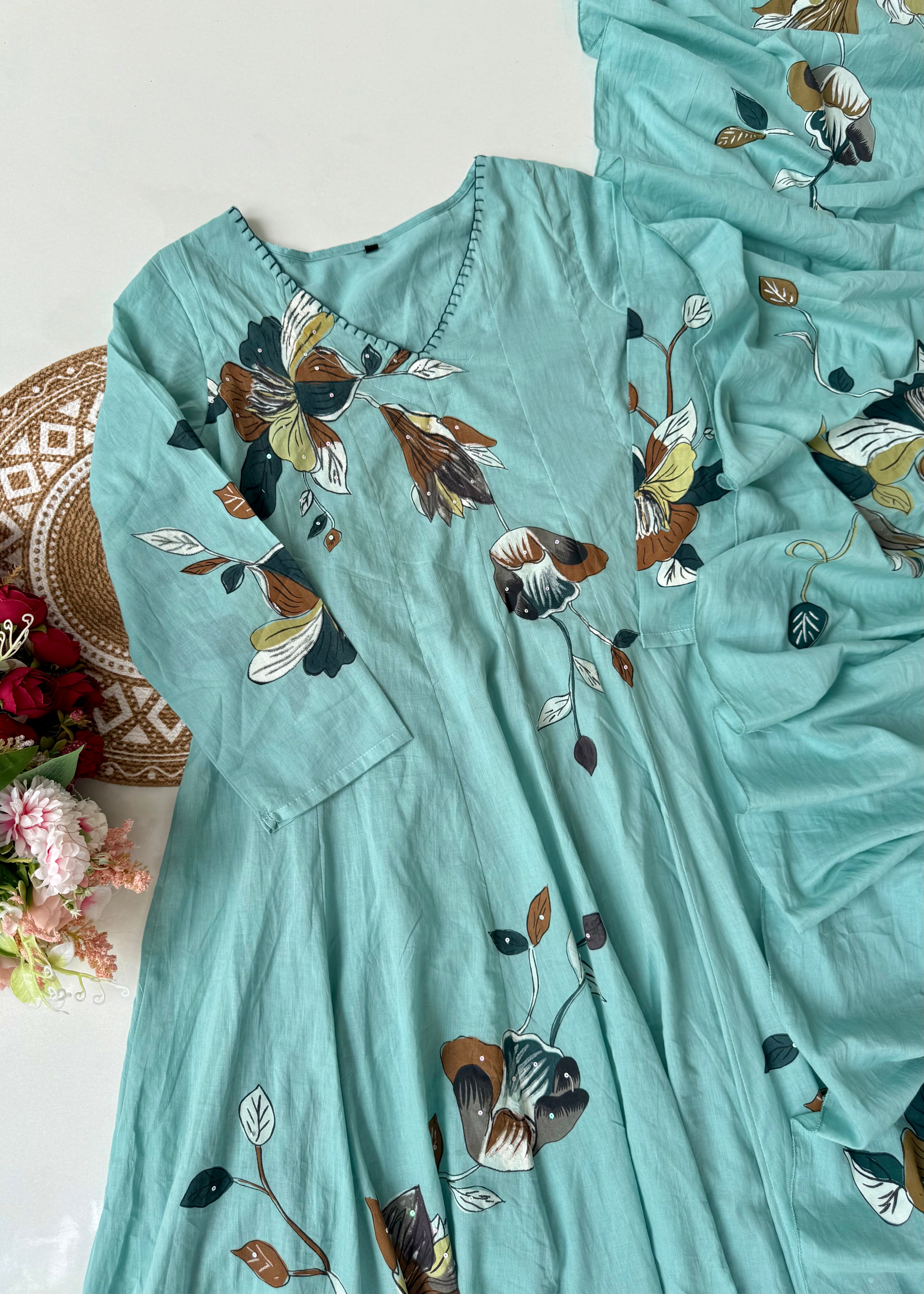 Premium mul cotton anarkali kurti with beautiful hand brush print all over the the top with a hand print mul cotton dupatta and a cotton bottom